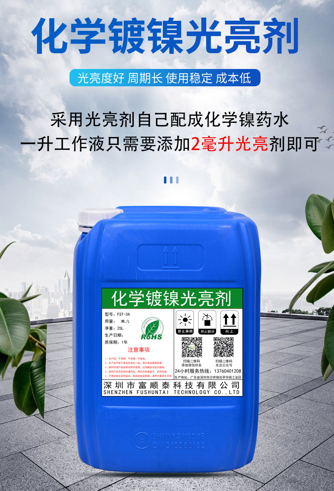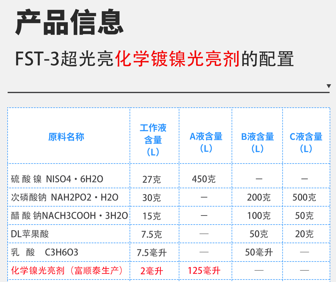 用于化学镍中作为、光亮剂、稳定剂、络合剂、作用,具有快速出光、镀层细腻、镀速快、稳定性好,使用周期长等优点。 |